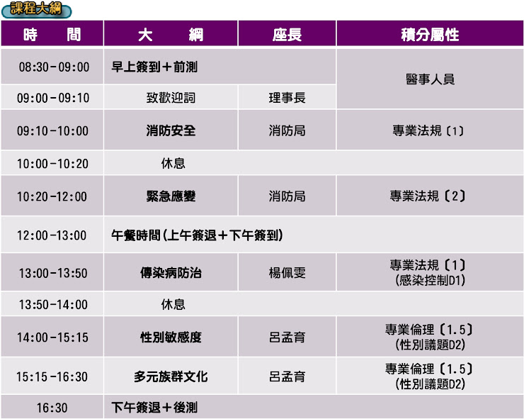 醫事人員上完本課程可獲得專業法規4點及專業倫理3點,共7點(其中已包括感染管制及性別議題之課程,符合換照必修規定)。